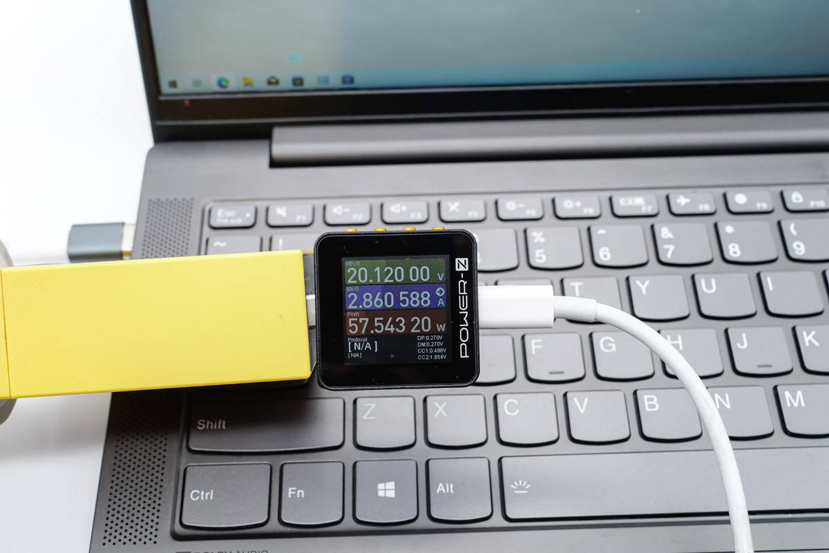 First of all, let's look at fast charging. Use a 100W charger with a straight-head magnetic adapter to charge the laptop with a power of 20.12V 2.86A 57.54W.