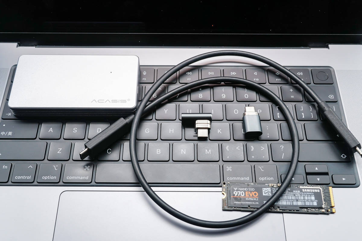 Next, let's take a look at the data transmission test. The tools used are Samsung 970 EVO solid-state drive, Thunderbolt 3 hard disk box, Thunderbolt 3 data cable, and two adapters.