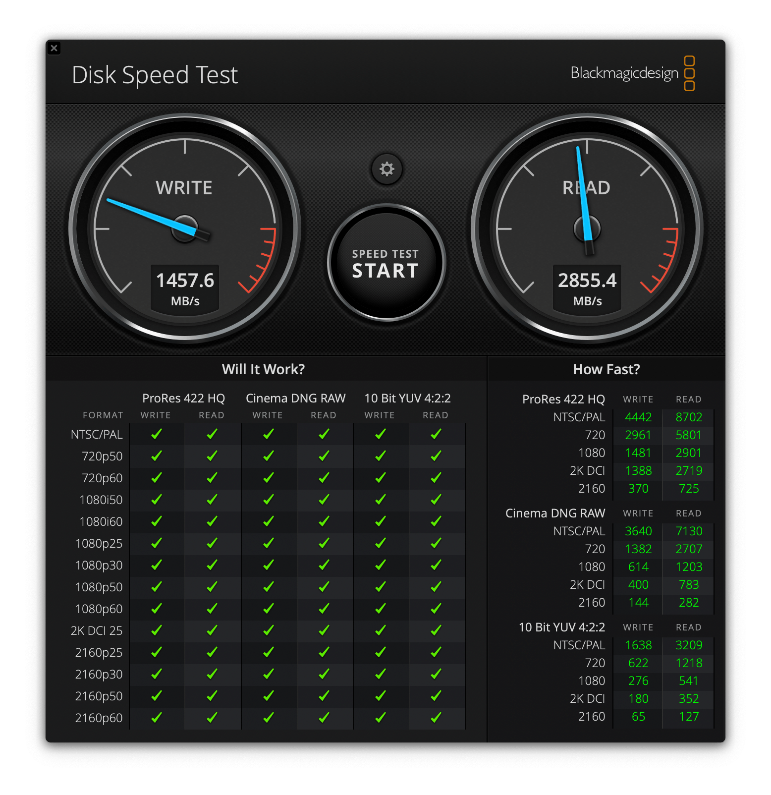 Using the Disk Speed Test on the MacBook Pro to test the transfer speed, the measured write speed is 1457.6MB/s and the read speed is 2855.4MB/s. (The actual write speed of the Samsung X5 hard drive here is 1700MB/s, and the read speed is 2400MB/s)